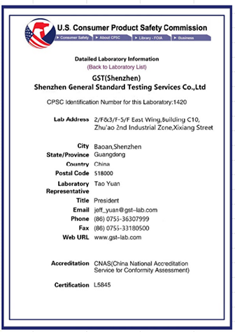 深圳市通规技术检测有限公司(简称gst)成立于2007年,是中国合格评定国家认可委员会(cnas)、美国消费品安全委员会(cpsc)、中国计量认证(cma)、国际安全运输协会(ista)认可实验室,同时也是国家高新技术企业、中国汽车工程学会会员、中国标准化协会汽车标准化分会团体会员、美国纺织化学师与印染师协会(aatcc)会员、美国材料与试验协会(astm)会员、中国玩具和婴童协会(ctjpa)会员